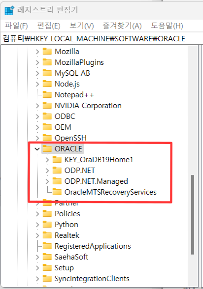 - Windows 64bit의 경우, HKEY_LOCAL_MACHINE\SOFTWARE\WOW6432Node\Oracle* 모두 삭제